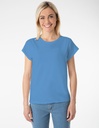 Das Laura-T-Shirt aus Eukalyptusfaser ist hellblau. Es hat eine lockere Passform und hochgekrempelte Ärmel: dank des natürlichen und organischen Stoffes (Tencel) einer unserer Bestseller.