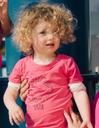 The short-sleeved Alex T-shirt is made of eucalyptus fibre (Tencel). It has two press buttons on the shoulder to make it more practical for your newborn to wear from 0 to 24 months. The colour is pink/fuchsia and features a print of a little smiley face and the word 'Sis'. Perfect for a little sister.