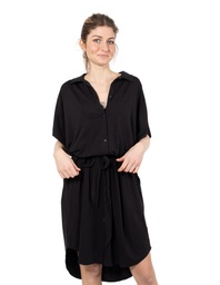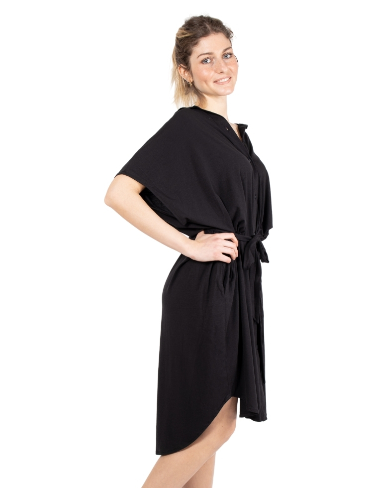 Elegant women's dress in soft cotton linen. The model is embellished with tone-on-tone buttons that define the neckline and a tie at the waist. Comfortable, breathable and perfect for all occasions.